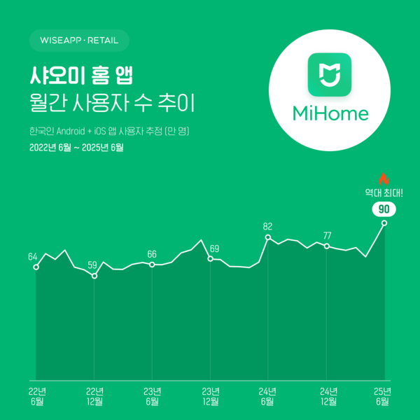 와이즈앱·리테일이 한국인 스마트폰 사용자(Android+iOS)를 표본 조사한 결과, 2025년 6월 샤오미 홈 앱의 MAU는 90만 명으로, 앱 출시 이후 역대 최대치를 기록한 것으로 나타났다.
