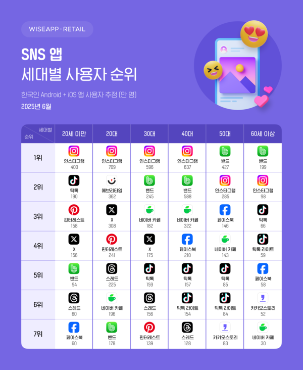 와이즈앱·리테일이 한국인 스마트폰 사용자(Android+iOS)를 표본 조사한 결과, 2025년 6월 세대별 SNS 앱 사용자 순위에서 40대 이하는 ‘인스타그램(Instagram)’, 50대 이상에서는 ‘밴드’가 1위를 차지했다. 그중 40대 한국인이 가장 많이 사용한 SNS 앱은 전년 동월에는 ‘밴드’였으나 올해 ‘인스타그램’으로 순위가 변동됐다.