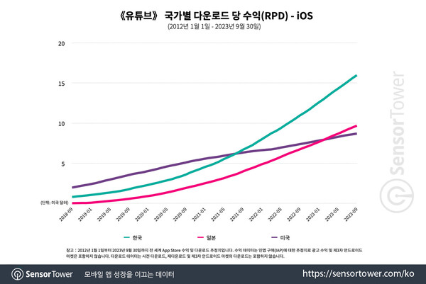 한국은 동기간 누적 소비자 지출액 3억 7000만 달러, 누적 다운로드 수 2300만 건으로 다운로드 당 수익(RPD)이 16달러에 달합니다. 이는 전 세계에서 가장 높은 수치입니다. 《유튜브》의 소비자 지출액에 기여한 주요 국가의 다운로드 당 수익을 비교했을 때, 한국은 각각 9.7달러와 8.7달러를 기록한 일본과 미국을 크게 앞질렀습니다.