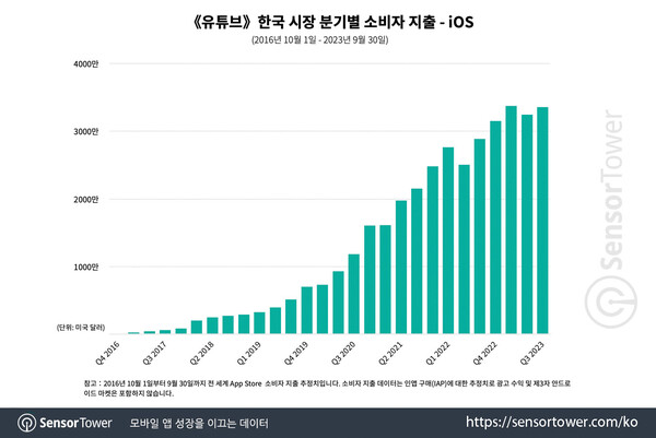 2016년 ‘유튜브 레드(현 ‘유튜브 프리미엄’의 초기 명칭)’가 한국 시장에 처음 출시된 이후 소비자 지출은 계속해서 상승세를 보였습니다. 이러한 상승세에 힘입어 《유튜브》는 매출에 있어 2023년을 상징적인 해로 보내고 있습니다. 《유튜브》의 분기별 소비자 지출은 2023년 1분기에 가장 높았으며, 두 번째는 2023년 3분기 그리고 세 번째는 2023년 2분기였습니다. 2023년 1분기, 2분기, 3분기의 소비자 지출액은 작년 동기 대비 각각 22%, 30%, 16% 증가한 수치였습니다.