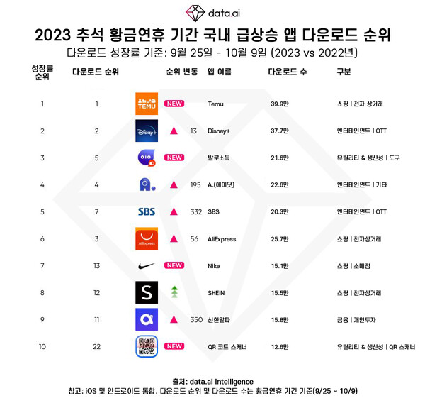 data.ai에 의하면, 올해 추석부터 한글날까지 이어진 긴 연휴 기간(9/25~10/9) 동안에는 모바일과 함께 휴식을 즐기는 모바일 유저와 유동 인구의 앱 사용으로 인해 다양한 장르의 앱들이 급상승한 것으로 나타났다. 먼저, 가장 큰 성장률을 보이면서 비게임 앱 다운로드 1위에도 오른 중국의 초저가 이커머스 앱 ‘테무(Temu)’가 연휴 기간 동안만 국내에서 약 40만 건 다운로드 되며 인기몰이를 했다. 오리지널 시리즈 ‘무빙’과 ‘최악의 악’ 등으로 많은 관심을 받고 있는 OTT 앱 ‘디즈니+(Disney+)’ 또한 연휴 기간에 많은 유저들을 매료시키며 38만 건에 육박하는 다운로드 수에 힘입어 급상승 순위 2위를 차지했다.