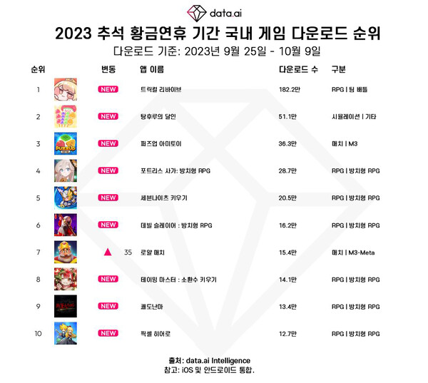 황금연휴 게임 다운로드 차트는 수집형 RPG, 방치형 RPG, 매치류 게임들이 차지