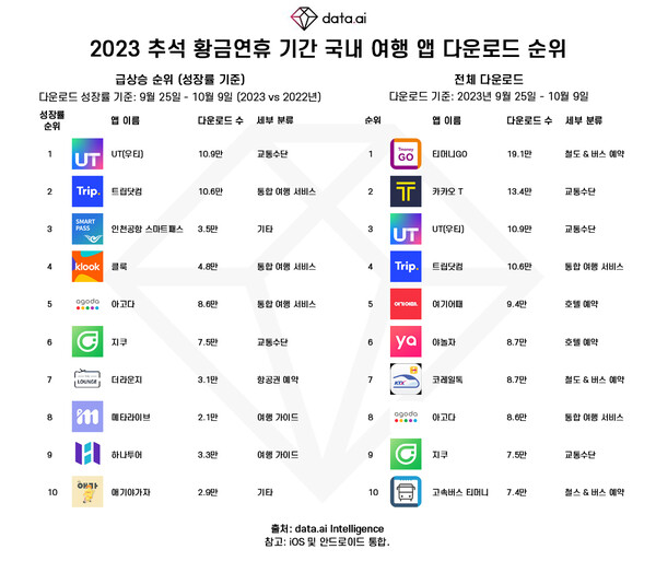 데이터 및 분석 플랫폼 data.ai(구 앱애니)가 올해 추석부터 한글날까지 이어진 황금연휴 동안의 국내 모바일 앱 통계를 공개했다.