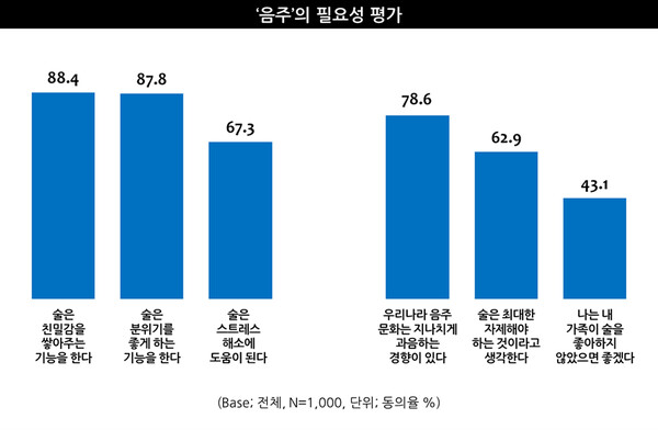 단, ‘음주’의 긍정적인 기능을 높게 평가하면서도, 술을 최대한 자제해야 한다(52.0%(2021) → 58.9%(2023) → 62.9(2025))는 인식이 꾸준히 증가세를 보이고 있는 점은 주목할 만한 결과였다. 우리나라 음주 문화는 지나치게 과음하는 경향이 있다(78.6%, 동의율)는 우려가 큰 만큼, 술을 즐기는 문화 속에서도 과도한 음주에 대한 경계심과 절제의 필요성을 강조하는 태도가 공존하고 있는 모습이었다.