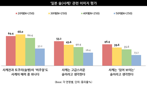 아울러 이들 세대가 사케의 ‘비주얼적인 요소’나 ‘고급스러운 이미지’에 대해 상대적으로 높은 호감을 내비친 것으로 미루어, 사케가 ‘맛있는 술’ 이전에 ‘경험하고 싶은 술’로 소비되고 있음을 짐작해 볼 수 있었다. 나아가 전체 응답자의 상당수가 향후 사케를 마셔 볼 의향이 있다(74.3%, 동의율)고 밝힌 만큼, 주류 시장에서 사케의 존재감은 더욱 확대될 것으로 전망해 볼 수 있었다.