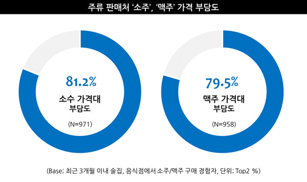 전반적으로 술은 술집이나 음식점 등 주류 판매처(48.6%)에서 먹는 경우가 많은 편이었고, 맥주(82.4%, 중복응답), 일반 소주(74.0%)를 먹는 비율이 압도적으로 높게 나타났다. 단, 최근 주류 가격 상승에 대한 부담감(소주 81.2%, 맥주 79.5%)이 커지면서, 술자리 약속이나 모임 자체에 대한 심리적 장벽(48.9%, 동의율)이 보다 높아지고 있는 모습이었다. 이에 술값을 더치페이하는 문화가 이전 조사 대비 소폭 증가했으며(50.7%(2023) → 58.0(2025)), 2, 3차는 집이나 외부(야외 공공장소)에서 먹는 문화(47.9%(2023) → 50.8(2025))가 한층 두드러지고 있음을 살펴볼 수 있었다.
