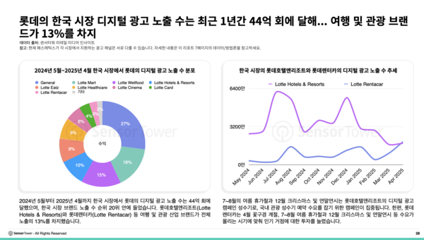 2024년 5월부터 2025년 4월까지 한국 시장에서 롯데의 디지털 광고 노출 수는 44억 회에 달했으며, 한국 시장 브랜드 노출 수 순위 20위 안에 들었다. 롯데호텔앤리조트(Lotte Hotels & Resorts)와 롯데렌터카(Lotte Rentacar) 등 여행 및 관광 산업 브랜드가 전체 노출의 13%를 차지했다. 이를 바탕으로 여행 및 관광 브랜드 중에서는 4위에 올랐으며, 복합 기업 중 가장 높은 순위였다.