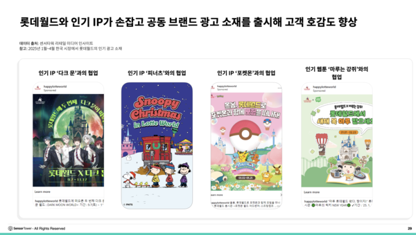 또한 롯데월드의 상위 광고 소재를 살펴보면 다크문, 피너츠, 포켓몬, 마루는 강쥐 등 인기 IP와 손잡은 공동 브랜드 광고 소재가 눈에 띄었다. 롯데월드는 이러한 소재를 통해 고객 호감도를 향상시켰다.