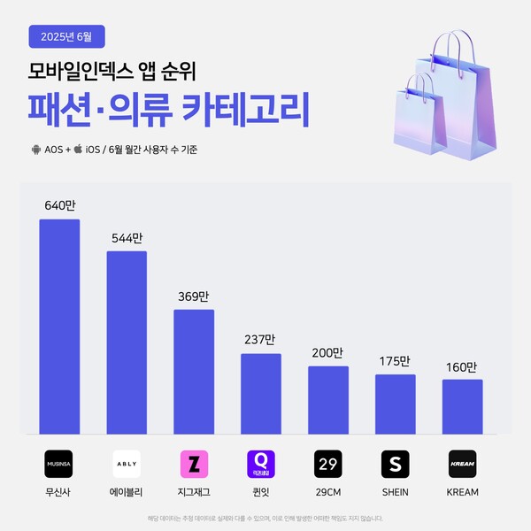 2위는 544만 명을 기록한 에이블리, 3위는 369만 명의 지그재그가 차지했다. 상위권 플랫폼들은 주로 여성 사용자 중심의 쇼핑 편의성과 트렌드 반영이 강점으로 꼽힌다.