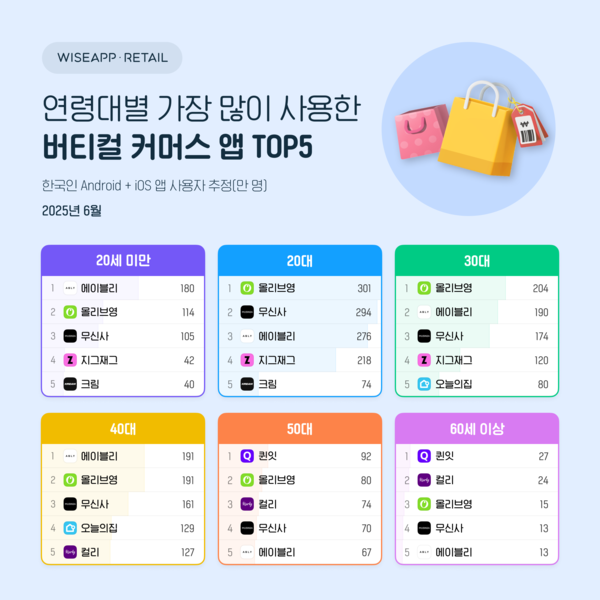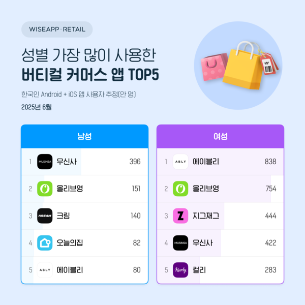 와이즈앱·리테일이 한국인 스마트폰 사용자(Android+iOS)를 표본 조사한 결과, 2025년 6월 한국인이 가장 많이 사용한 버티컬 커머스 앱은 ‘에이블리’로 MAU 918만 명을 기록했다. 그 뒤를 이어 올리브영 905만 명, 무신사 818만 명, 지그재그 480만 명, 컬리 354만 명, 오늘의집 349만 명, 29CM 235만 명, 퀸잇 231만 명, 크림(KREAM) 202만 명, 화해 152만 명 순으로 나타났다.