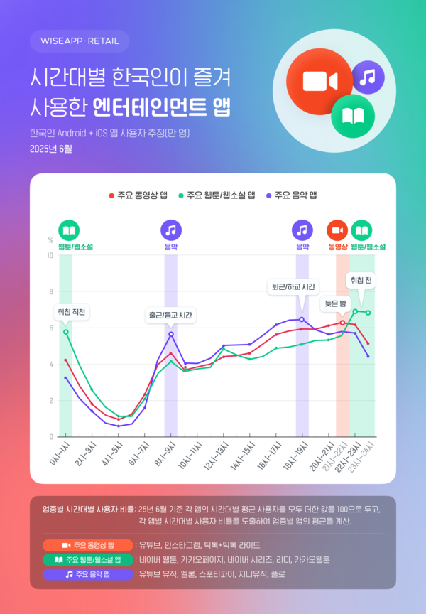실시간 앱·결제 데이터 기반 시장/경쟁사 분석 솔루션 와이즈앱·리테일이 한국인의 시간대별 엔터테인먼트 앱 사용 행태를 조사해 발표했다.