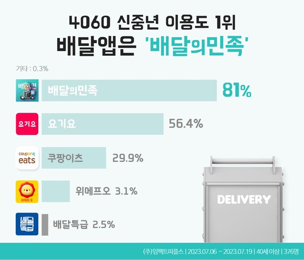 시니어 소셜벤처 임팩트피플스(대표 신철호)가 2023년 7월 6일부터 7월 19일까지 40세 이상 남녀 376명을 대상으로 4060 신중년의 음식배달앱 이용 트렌드 조사를 진행했다.