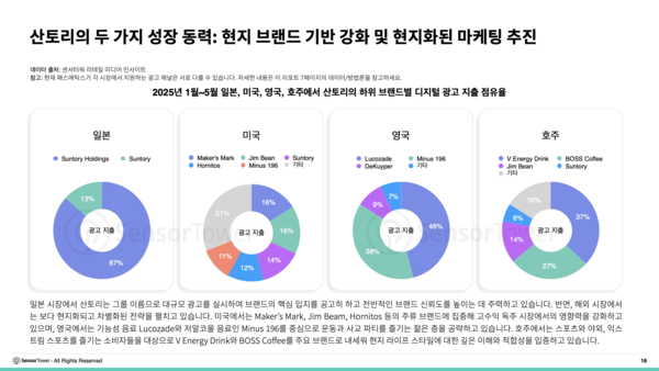또한 산토리는 현지화된 마케팅 추진으로 성장 동력을 확보하고 있다. 일본 시장에서 산토리는 그룹 이름으로 대규모 광고를 실시해 브랜드의 핵심 입지를 공고히 하고 전반적인 브랜드 신뢰도를 높이는 데 주력하고 있다.