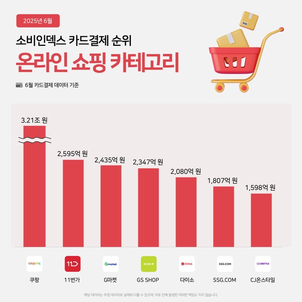 2025년 6월 기준, 온라인 쇼핑 분야에서 카드 결제액이 가장 높은 플랫폼은 쿠팡으로 나타났다. 카드결제 데이터를 분석한 결과, 쿠팡은 3조 2,100억 원의 월간 카드 결제액을 기록하며 압도적인 1위를 차지했다.
