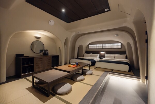 로비에는 셀프 미니바가 설치되어 고객 편의성을 높였고, 기존 곡선형 구조물을 활용한 아치형 인테리어는 동굴 특유의 구조미를 강조하며 콘셉트의 높은 몰입을 유도한다. 특히 최대 4인까지 투숙 가능한 료칸 콘셉트의 파티룸 ‘캐번룸’은 명확한 콘셉트 설계를 기반으로 상품성과 높은 객단가를 형성할 수 있는 수익성까지 모두 확보한 객실로 주목받고 있다.