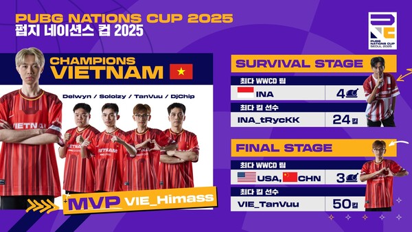 7월 25일부터 27일까지 3일간 펼쳐진 파이널 스테이지 최종 결과, 베트남 대표팀은 누적 포인트 216점으로 우승 트로피를 들어올렸다. 케르베로스 e스포츠(CERBERUS Esports)와 디 익스펜더블스(The Expendables) 등 베트남 프로팀 출신 선수들로 구성된 대표팀은 강력한 전투력과 안정적인 운영을 바탕으로 세계 정상에 올랐으며, ‘히마스(Himass)’ 선수는 총 44킬과 7,935 대미지를 기록하며 MVP에 선정됐다.