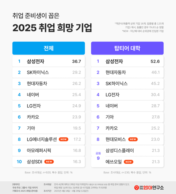취업 희망 기업 1위 삼성전자… 탑티어 대학서 현대모비스·에쓰오일 순위권 진입