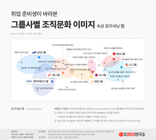 고급 인재 유치를 위한 글로벌 경쟁이 심화되면서 하반기 채용을 앞둔 기업들의 움직임이 분주해지고 있다. 대학내일20대연구소는 2025년 취업 준비생의 인식을 파악하기 위해 대학과 전공, 학교 소재지별 취업 준비 실태를 조사했다. 또 국내 주요 그룹사와 IT 기업, 소비재·식품 기업에 대한 조직문화 이미지를 비교해 분석했다. 이번 조사는 전국 4년제 대학교 3학년 이상 미취업자 중 취업 준비 경험이 있으며, 취업 희망 1순위 또는 2순위로 공·사기업을 고려하는 자 920명을 대상으로 진행됐다.