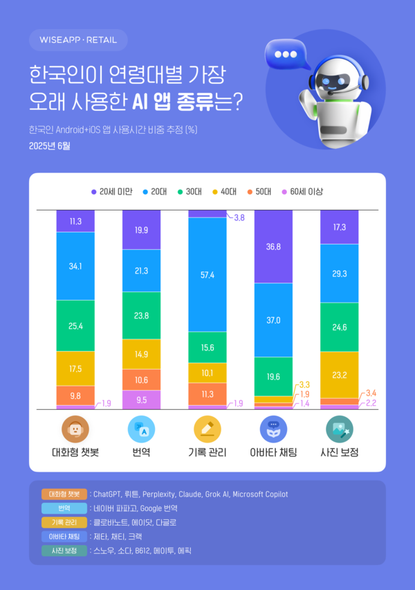 실시간 앱·결제 데이터 기반 시장/경쟁사 분석 솔루션 와이즈앱·리테일이 AI 앱 종류별 합산 사용 시간의 연령대별 비율을 조사해 발표했다.