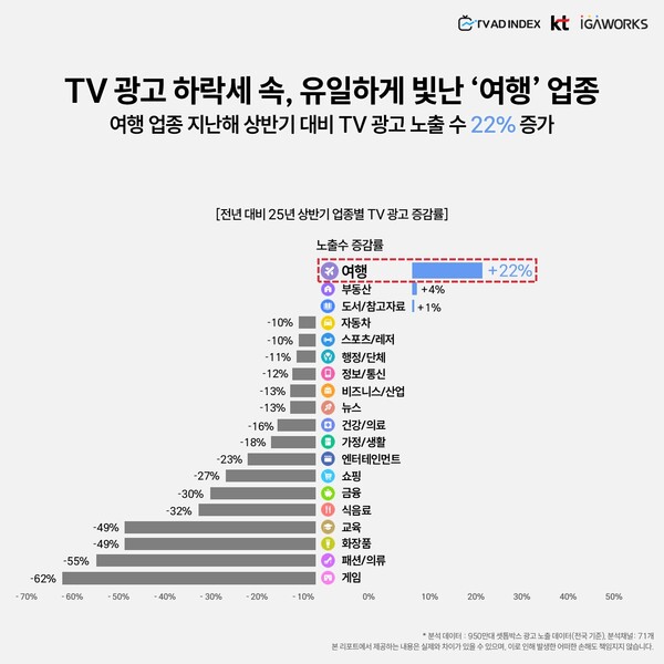 전반적인 TV 광고 시장은 감소세를 보였지만, 여행 업종만 유일하게 증가세를 보였다. 2025년 상반기 기준 여행 업종의 광고 노출 수는 전년 동기 대비 22% 증가했다. 반면, 게임, 패션·의류, 화장품, 교육 등 주요 업종은 30~60%가량 광고가 줄었다.