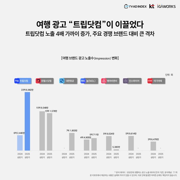2025년 상반기 기준 트립닷컴의 광고 노출 수는 23억 6,982만 회로, 2위인 호텔스닷컴보다 7억 7,000만 회 이상 많았다. 대한항공, 에어비앤비, 놀(NOL) 등의 브랜드도 광고를 강화했지만, 트립닷컴과는 큰 격차를 보였다.