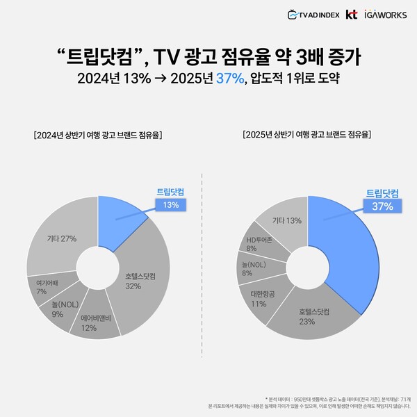 2025년 상반기 TV 광고 시장에서 트립닷컴이 눈에 띄는 성과를 거두며 여행 업계 1위 브랜드로 떠올랐다. 전년 동기 대비 약 4배 가까이 광고 노출 수가 증가하며, 전체 여행 광고 시장에서 37%의 점유율을 기록했다. 지난해 상반기 점유율이 13%였던 것과 비교하면 3배 가까이 증가한 수치다.
