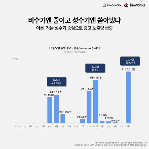 트립닷컴은 계절별 성수기를 중심으로 광고를 집중하는 전략을 펼쳤다. 2024년 여름과 겨울 성수기에 이어 2025년 여름 시즌에도 대규모 광고를 집행하며 성과를 끌어올렸다. 특히 2025년 6월 한 달간 광고 노출 수는 11억 6,516만 회로, 전년 동기 대비 약 두 배 이상 증가했다.