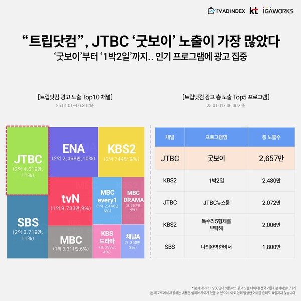 트립닷컴은 방송 채널 중 JTBC, KBS2, SBS 등을 중심으로 광고를 집중했다. 특히 JTBC의 예능 프로그램 ‘굿보이’는 총 2,657만 회의 광고 노출 수로 가장 많은 수치를 기록했다. KBS2의 ‘1박 2일’, JTBC ‘뉴스룸’, KBS2 ‘독스리5형제를 부탁해’, SBS ‘나일한번한번서’ 등 인기 프로그램에도 광고가 집중됐다.