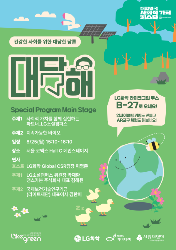 희망친구 기아대책과 LG화학이 공동으로 추진하는 교육 사회공헌 사업 ‘라이크그린’이 오는 8월 25일부터 26일까지 서울 삼성동 코엑스에서 열리는 ‘2025 대한민국 사회적가치 페스타’에 참여해, ESG 문화를 주제로 한 유튜브 ‘대담해’ 라이브 방송을 진행한다고 20일 밝혔다.