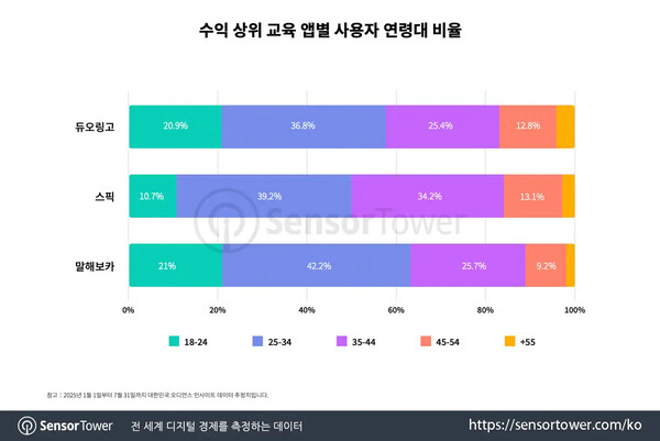 2025년 아시아 교육 앱 시장에서는 글로벌 리더 《듀오링고》가 여전히 강세를 보이는 가운데, 《스픽》과 《말해보카》가 수익 순위에서 각각 2위, 3위를 차지하며 다른 지역과는 차별화된 경쟁 구도를 형성하고 있습니다.