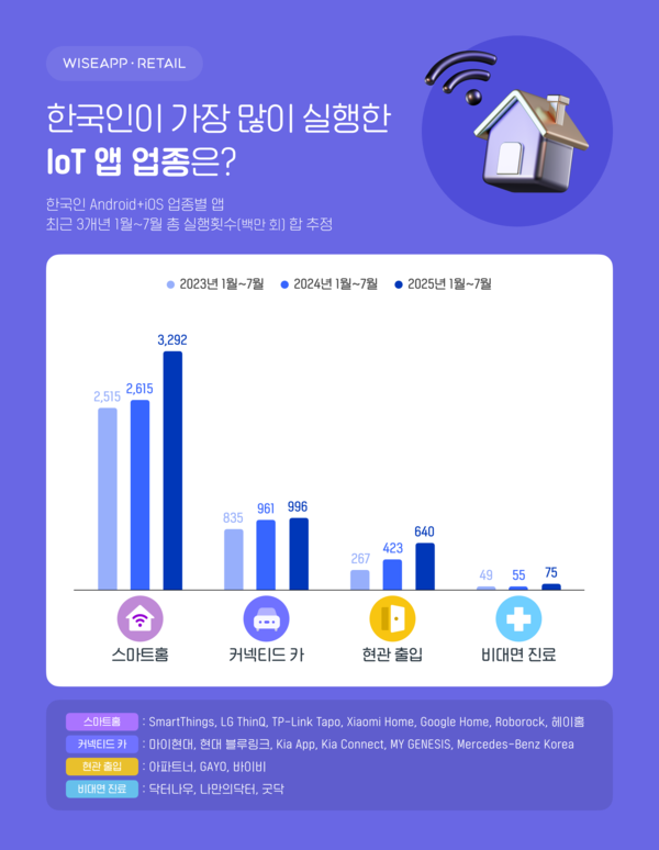 와이즈앱·리테일이 한국인 스마트폰 사용자(Android+iOS)를 표본 조사한 결과, 2025년 1월부터 7월까지 주요 IoT 앱 업종인 ‘스마트홈’, ‘커넥티드 카’, ‘현관 출입’, ‘비대면 진료’의 총 실행 횟수가 2023년과 2024년 동기간 대비 2년 연속 증가한 것으로 나타났다.