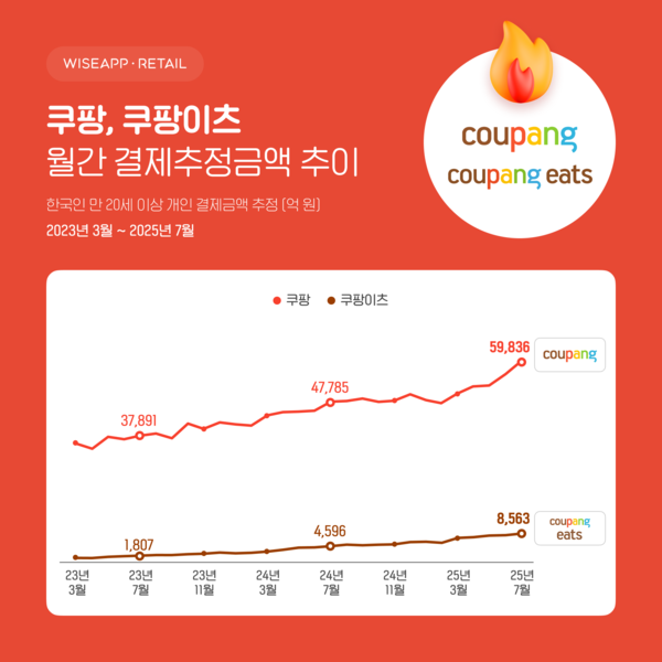 와이즈앱·리테일이 만 20세 이상 한국인이 신용카드, 체크카드, 계좌이체, 소액결제로 결제한 금액을 표본 조사한 결과, 2025년 7월 쿠팡의 월간 결제추정금액은 5조 9,836억 원, 쿠팡이츠는 8,563억 원으로 각각 역대 최대치를 기록한 것으로 나타났다.