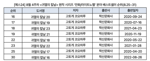 특히 ‘극장판 귀멸의 칼날: 무한성편’ 3부작의 배경이 되는 <귀멸의 칼날 16~23> 8권이 모두 영화개봉 직후인 8월 4주차 예스24 ‘만화/라이트노벨’ 분야 베스트셀러 30위권 내 자리하며 영화의 감동을 원작으로 간직하고자 하는 독자들의 경향을 확인할 수 있었다.