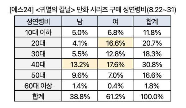 또한 <귀멸의 칼날> 만화 시리즈의 구매자 성연령비도 눈에 띄었다. 평소 만화책이나 굿즈 구매가 익숙한 것으로 알려진 20대 여성(16.6%)뿐만 아니라 40대 여성(17.6%)과 40대 남성(13.2%)에게도 많은 지지를 얻으며 특정 성별이나 연령대에 국한되지 않는 인기를 보였다.