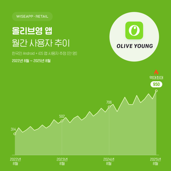 와이즈앱·리테일이 한국인 스마트폰 사용자(Android+iOS)를 표본 조사한 결과, 2025년 8월 올리브영 앱의 월간 사용자 수는 950만 명으로 역대 최대치를 기록했다. 이는 전년 동월 706만 명 대비 35% 증가한 수치다.