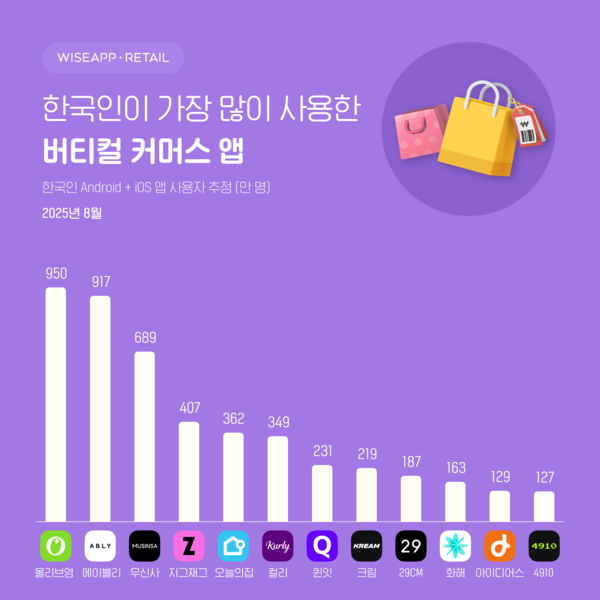 지난 8월 한국인이 가장 많이 사용한 버티컬 커머스 앱 순위에서 올리브영은 MAU 950만 명으로 1위를 차지했다. 그 뒤를 이어 에이블리 917만 명, 무신사 689만 명, 지그재그 407만 명, 오늘의집 362만 명, 컬리 349만 명, 퀸잇 231만 명, KREAM(크림) 219만 명, 29CM 187만 명, 화해 163만 명, 아이디어스 129만 명, 4910 127만 명 순으로 나타났다.