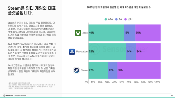 반면 AAA 게임은 플레이스테이션과 엑스박스에서 각각 전체 다운로드의 52%, 49%를 차지하며 우위를 점하고 있다. 이는 각 플랫폼이 블록버스터 프랜차이즈와 주요 스튜디오 신작에 중점을 두고 있음을 보여준다. 스팀에서는 AAA 퍼블리셔의 다운로드 비중이 27%에 그쳤다.
