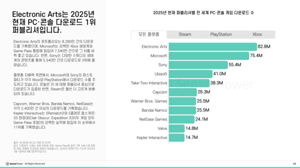 2025년 현재까지 퍼블리셔별 전 세계 PC·콘솔 게임 다운로드 수를 살펴보면 Electronic Arts(EA)가 1위를 차지했다. EA의 포트폴리오는 총 8280만 건의 다운로드를 기록했으며, Microsoft는 강력한 엑스박스 생태계와 Game Pass 통합 덕분에 7140만 건으로 그 뒤를 바짝 쫓고 있다. 한편 Sony는 다양한 스튜디오 생태계의 콘텐츠를 기반으로 5540만 건의 다운로드를 기록하며 3위에 올랐다.