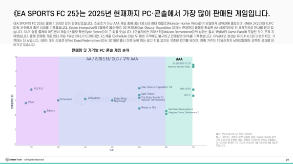 PC·콘솔에서 가장 많이 판매된 게임은 ‘EA Sports FC 25’로, 올해만 1200만 장이 판매됐다. 스포츠가 아닌 AAA 게임 중에서는 ‘Monster Hunter Wilds’가 유일하게 상위권에 올랐으며, ‘NBA 2K25’와 ‘UFC 5’도 높은 순위를 기록했다. 올해 판매량 기준 인디 게임 1위는 ‘R.E.P.O.’였다.