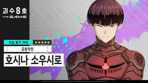 아카츠키 게임즈(Akatsuki Games Inc.)는 토호(TOHO CO., LTD.), 프로덕션 I.G.(Production I.G.)와 공동으로 개발한 자이언트 킬링 RPG ‘괴수 8호 THE GAME’에서 신규 플레이어블 캐릭터 ★5 [공동작전] 호시나 소우시로를 9월 20일 업데이트했다고 밝혔다.