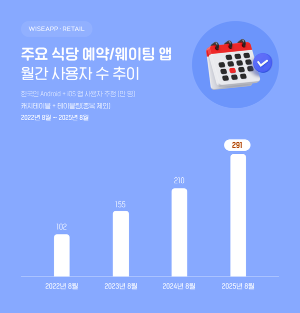 와이즈앱·리테일이 한국인 스마트폰 사용자(Android+iOS)를 표본 조사한 결과, 최근 3년간 주요 식당 예약/웨이팅 앱의 월간 사용자 수는 2022년 8월 102만 명에서 2025년 8월 291만 명으로, 약 185% 증가한 것으로 나타났다.