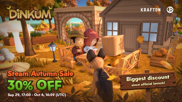 ㈜크래프톤(대표 김창한)은 생존 생활 시뮬레이션 게임 ‘딩컴(Dinkum)’이 Steam 가을 할인 프로모션에 참여한다고 밝혔다. 올해 4월 정식 출시(1.0) 이후 꾸준히 사랑받아온 ‘딩컴’이 이번 프로모션을 통해 정식 출시 후 최대 폭의 할인 혜택을 선보인다.