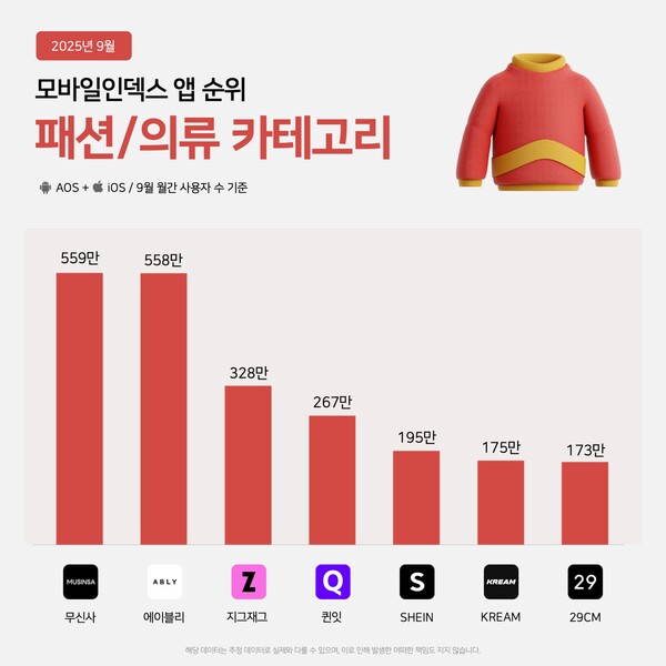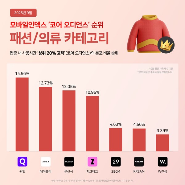 2025년 9월 기준, 패션/의류 앱 사용자 수 1위는 무신사(5,593,813명)로 나타났으며, 에이블리(5,583,156명), 지그재그(3,279,258명)가 그 뒤를 이었다. 코어 오디언스 비중에서는 퀸잇이 14.56%로 1위를 기록했고, 에이블리(12.73%), 무신사(12.05%)가 뒤를 따랐다. 업종 내 상위 20% 사용자의 앱 사용 집중도가 높은 것으로 나타났다.