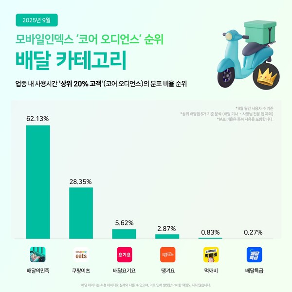 배달의민족이 압도적인 월간 사용자 수 22,200,280명, 코어 오디언스 비중 62.13%로 1위를 기록했다. 쿠팡이츠가 12,070,486명, 28.35%로 2위, 배달요기요가 4,490,156명, 5.62%로 3위에 올랐다. 대형 배달 앱들이 시장을 주도하는 양상이다.