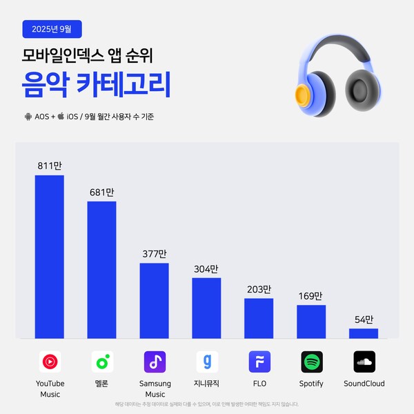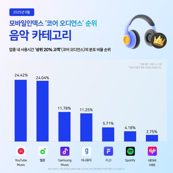 YouTube Music(8,108,439명)과 멜론(6,814,787명)이 사용자 수 부문 상위를 차지했으며, 코어 오디언스 점유율도 각각 24.42%, 24.04%로 상당한 비중을 보였다. 삼성뮤직, 지니뮤직, FLO 등이 뒤를 이었다.