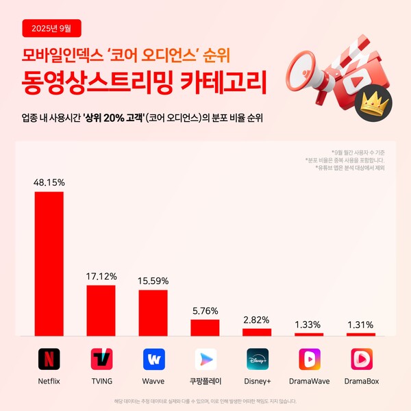 넷플릭스가 14,324,510명으로 압도적인 사용자 수를 기록, 코어 오디언스 비중도 48.15%로 가장 높았다. TVING, 쿠팡플레이, Wavve가 주요 경쟁자로 이름을 올렸다.