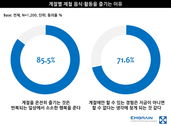 이처럼 평소 제철 음식이나 활동을 즐기고자 하는 이유로는 반복되는 일상에서 새로운 즐거움과 활력을 얻을 수 있다(55.3%, 중복응답)는 점을 가장 우선적으로 꼽았고, 다른 계절에는 할 수 없는 특별한 경험(52.0%)이자 딱 그때만 할 수 있는 희소한 경험(48.9%)이란 응답이 뒤를 이었다. 특정 계절에만 경험할 수 있는 가치에 주목하며, 그 시기에 집중하려는 태도를 엿볼 수 있는 대목이었다. 실제로 계절은 온전히 즐기는 것이 일상에서 소소한 행복을 준다(85.5%, 동의율)는 데에 높은 공감대가 형성되어 있었고, 특정 계절에만 할 수 있는 경험은 지금이 아니면 할 수 없다는 생각에 찾게 되는 것 같다는 응답이 71.6%에 달한 결과를 확인할 수 있었다.