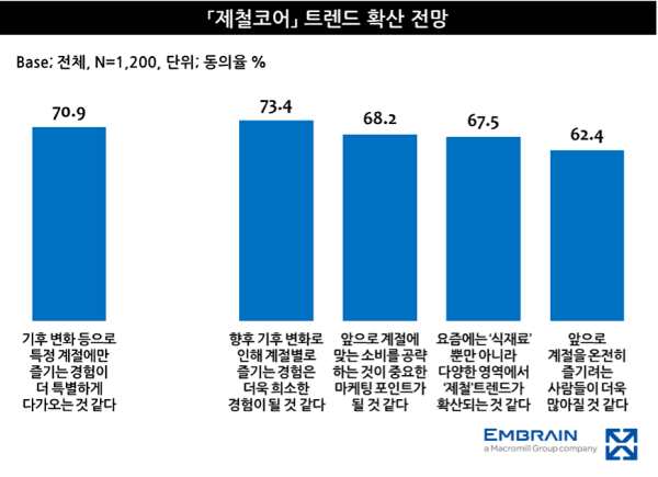 제철코어에 대한 성장 가능성도 긍정적으로 점쳐지고 있었다. 전체 응답자의 상당수가 앞으로 계절을 온전히 즐기려는 사람들이 더욱 많아질 것 같다(62.4%, 동의율)는 전망을 내비친 것으로, 계절에 맞는 소비를 공략하는 것이 중요한 마케팅 포인트가 될 것 같다(68.2%)는 의견까지 피력하고 있었다. 실