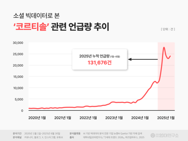 이처럼 감정 관리를 위해 다양한 루틴을 갖추는 경향도 두드러진다. 산책, 뜨개질, 수면 관리 같은 생활 습관뿐 아니라 스트레스 지표로 알려진 ‘코르티솔’에 대한 관심이 크게 증가했다. 관련 언급량은 전년 대비 1.5배 이상 증가했으며, 특히 ‘루틴’과 ‘삶의 질’과 함께 자주 언급되었다.