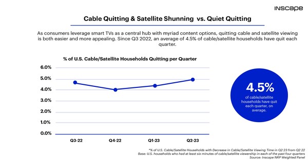 인스케이프의 최근 2023년 2분기 TV 시장 동향 보고서에 따르면, 미국 케이블/위성 가구의 약 5%가 올해 2분기에 위성 및 케이블 TV 옵션을 통해 콘텐츠 시청을 완전히 중단한 것으로 나타났다. 인스케이프의 데이터에 따르면, 남아 있는 가입자 중 상당수가 시청 시간도 크게 줄인 것으로 나타났습니다.